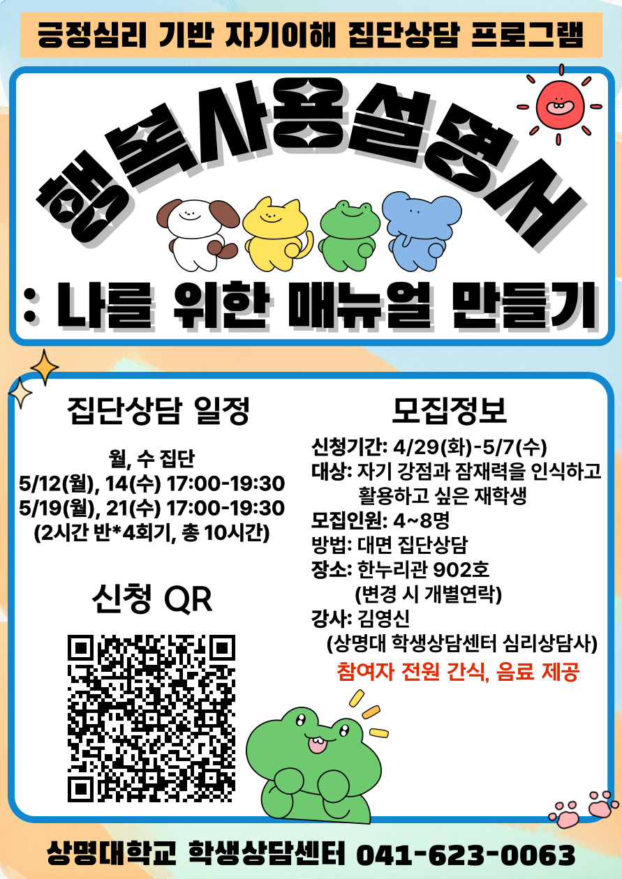 | 천안 [학생생활] | [학생상담센터(천안)] 25-1 자기이해 집단상담 <행복사용설명서: 나를 위한 매뉴얼 만들기> 신청 |